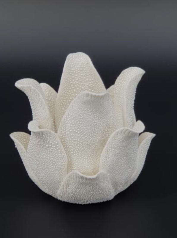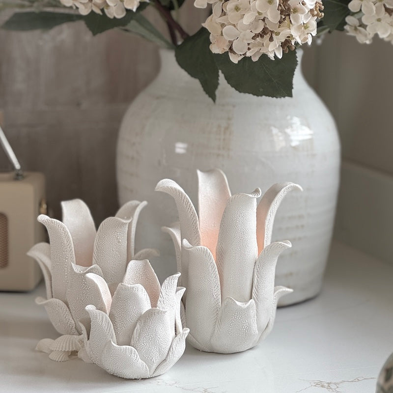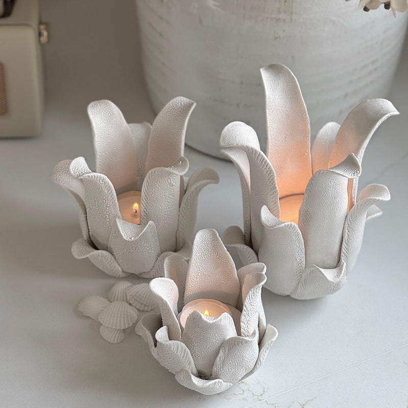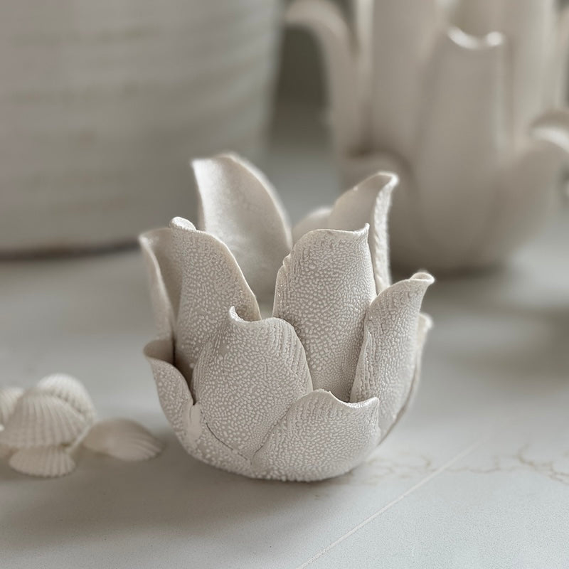 Het ontwerp van deze waxinelichthouder is geïnspireerd op bloemblaadjes en schelpen waardoor het een organische, bloemachtige vorm heeft. De buitenkant heeft een opvallende afwerking die lijkt op een schelpentextuur. Plaats een waxinelichtje in het midden en geniet van de warme gloed die door de unieke vorm wordt verspreid.