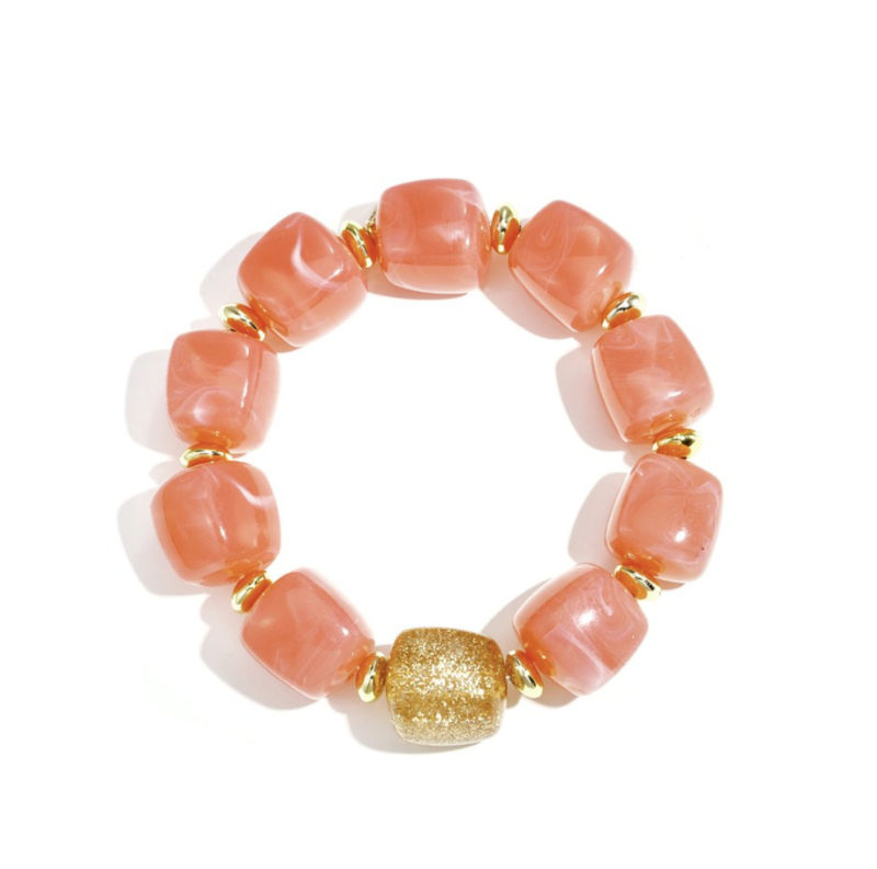 Deze stijlvolle elastische armband is gemaakt van grote koraalkleurige kralen met goudkleurige details. Door de zomerse uitstraling kun je hem makkelijk combineren met zowel casual als feestelijke outfits. Dankzijn het elastische ontwerp is de armband comfortabel te dragen en eenvoudig om de pols te schuiven.