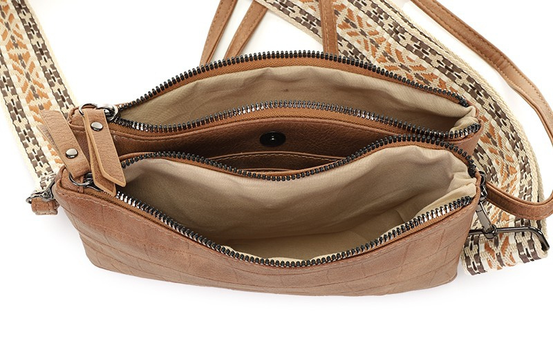 De croco print en de opvallende brede schouderband van de Sheffield geven het damestasje een unieke look. Hij is te dragen als schoudertas of crossbody tasje. De damestas wordt geleverd inclusief brede geweven schouderband. Naast de opvallende schouderband, zit er ook een tweede dunne effen schouderband bij de tas. De twee ruime, met rits afsluitbare vakken zijn ideaal om je mobiel in te doen, of andere waardevolle eigendommen. Een handig middenvak biedt een veilige plek voor pasjes en bevat insteekvakjes. Het verstopte middenvak is voorzien van een magneetsluiting zodat je bezittingen extra veilig zijn.