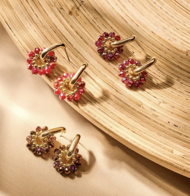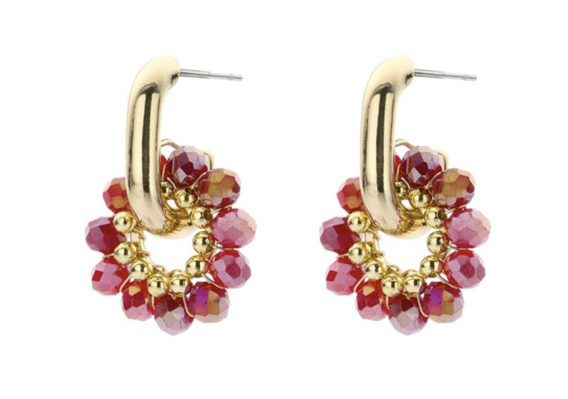 Voeg een speelse en elegante touch toe aan je look met deze opvallende oorbellen van Biba. De goudkleurige hoops zijn verfijnd afgewerkt en versierd met een trosje glanzende kralen in rode tinten, wat zorgt voor een chique uitstraling. Dankzij het lichte ontwerp zijn de oorbellen comfortabel om te dragen. Perfect voor bij zowel een dagelijkse outfit als een feestelijke gelegenheid.