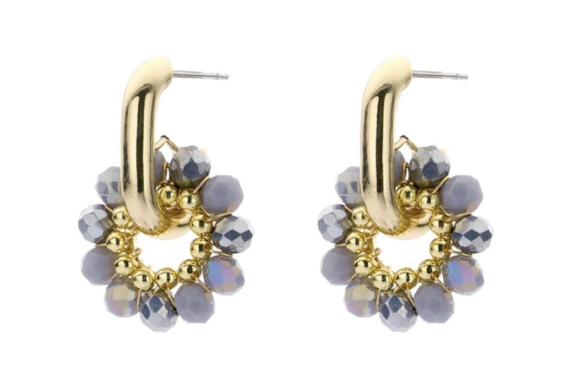 Voeg een speelse en elegante touch toe aan je look met deze opvallende oorbellen van Biba. De goudkleurige hoops zijn verfijnd afgewerkt en versierd met een trosje glanzende kralen in grijze tinten, wat zorgt voor een chique uitstraling. Dankzij het lichte ontwerp zijn de oorbellen comfortabel om te dragen. Perfect voor bij zowel een dagelijkse outfit als een feestelijke gelegenheid.